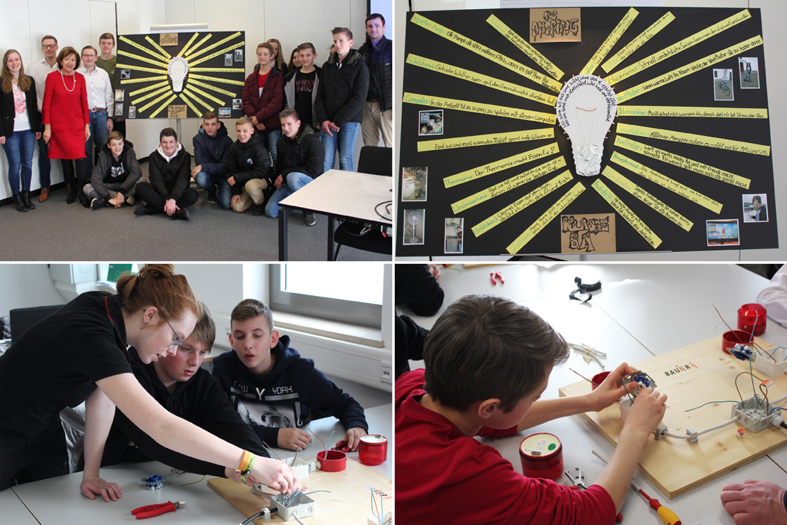 Bemerkenswert war das hohe Niveau der eingereichten Arbeiten aller teilnehmenden Schulklassen. Mit ihrem aufwändigen und beeindruckenden Projekt konnten jedoch die Ampfinger Schüler die Jury der BAUER Elektroanlagen einstimmig als Sieger überzeugen. Dabei haben sie zur Umsetzung des Projekts verschiedenste Unterrichtsfächer miteinbezogen. So wurde beispielweise im Fach AWT die Grundidee für die Teilnahme überlegt und geplant und in PCB die Geräte gesichtet und gesammelt. Im Fach Technik erfolgte der Zuschnitt der Grundplatte und die Gestaltung der Glühbirne sowie die Anbringung der LEDs. In Kunst wurde das Werk lackiert und im Deutschunterricht sind die Reime zu den Geräten entstanden. Im Gesamtwerk hat sich gezeigt, wie kreativ und fächerübergreifend Schulunterricht gestaltet werden kann und wie engagiert und eigenverantwortlich die Schüler das Projekt erarbeitet haben.