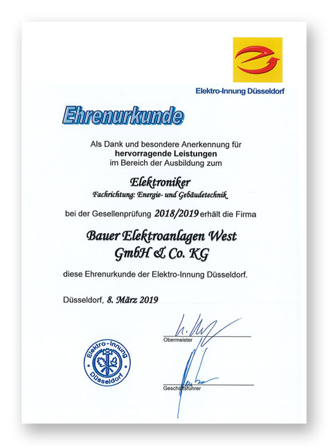 „Wir gratulieren allen zum erfolgreichen Abschluss ihrer Ausbildung. Unser besonderes Lob gilt dabei Fjodor Göttmann (Düsseldorf), Moritz Schaefer (Frankfurt) und Niklas Altmann (Buchbach), die für ihre ausgezeichneten Leistungen als jahrgangsbeste Lehrlinge 2018/19 ausgezeichnet wurden.“ so Franz Bauer, Geschäftsführer der BAUER Elektroanlagen. Last but not least wurde das Unternehmen BAUER durch die Elektroinnung Düsseldorf für die hervorragende Ausbildungsarbeit mit einer Ehrenurkunde geehrt.